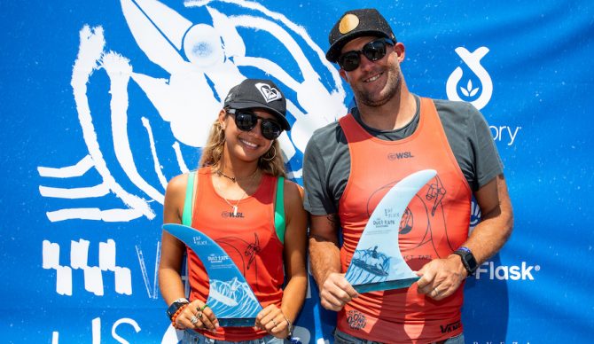 Kelis Kaleopa’a and Taylor Jensen pose with their trophies. Photo: Kenny Morris/WSL.