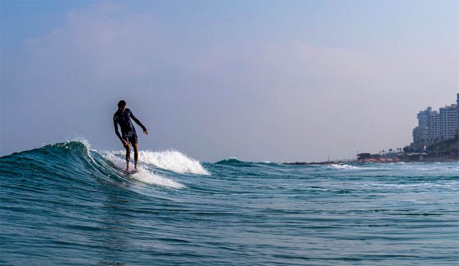“Although still small on a global scale, Israel’s thriving local surf community is not only home to over 40,000 surfers scattered over 200 kilometers of coastline.” Photo: Tal Abarbanel