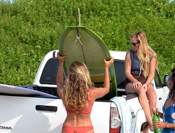 After years of trial and error and countless mishaps with swimsuits, our tester decided to do a thorough test of the latest styles to help all her surfer girls out. She reached out to her favorite brands and asked each to send her three of their current best bikinis or one pieces for surfing. She lives on Oahu, Hawaii, and spends a lot of time surfing in a swimsuit. In order to test these suits, she paddled out in small surf, overhead surf, and wore them while standup paddling to see how they fared in a wide range of conditions. After surfing in each, she picked her favorite suit from each brand.