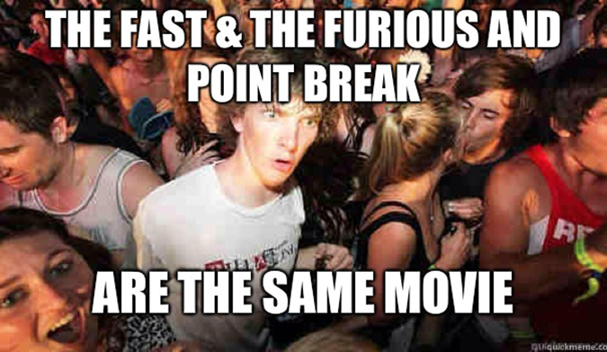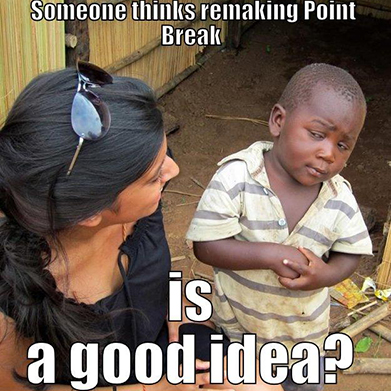 Everybody loves a good meme. That’s a proven scientific fact. Everybody. You know what else everybody loves? Point Break, that’s what. More than two decades after I single handedly put the kibosh on the Dead Presidents’ endless summer, people are still talking about the greatest surf tale ever told. It’s like that one time I beat SC in the Rose Bowl. People talked about that for a long time, and even though it made me a college football legend, it didn’t exactly blow my cover in my first FBI assignment. Anyway, I believe I was talking about memes: