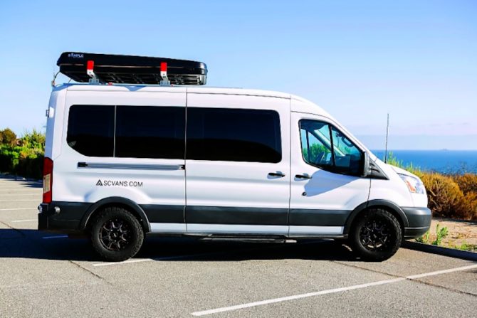 The van can holds 12 individual seats (and passengers) when fully loaded, or you can take out rows of seats individually and rearrange as needed. It comes in a low-top or high-top version (the high top is quite different), doesn’t have the price tag of the Sprinter, and may be harder to find on sites like Outdoorsy because it doesn’t have as much charm.