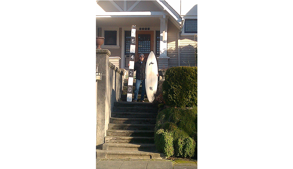On January 15th, Lucia Griggi flew into Seatac from Orange County, with about 10 metric tonnes of baggage that included her full photography kit of Canon D-Somethings with all the accoutrement. No sooner had she arrived then she was whisked away to the Queen Anne sector of Seattle, where she photographed the first of many portraits of surfers with their favorite surfboard(s) – this one was of Matt Warshaw, now living in Seattle.