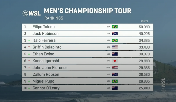 So how close is the rest of the field? Very. The 6-12 spots on the leaderboard are separated by less than 5,000 total points going into JBay. John John (currently number seven) is sitting out another event with his campaign presumably over. Kanoa Igarashi, sitting one spot outside of the Top 5 at the moment, is a literal heat swap away from replacing number five Ethan Ewing. Calum Robson could leapfrog into the Finals Day roster with two more heats than Igarashi and Ewing, and so on and so on. There are too many heats to surf and too many different possible outcomes to know how it will all shake out through Jbay and Teahupo’o, but a quick glimpse at the points break down per result can help eager stat geeks theorize who else in the Top 10 is within striking distance of Finals Day: