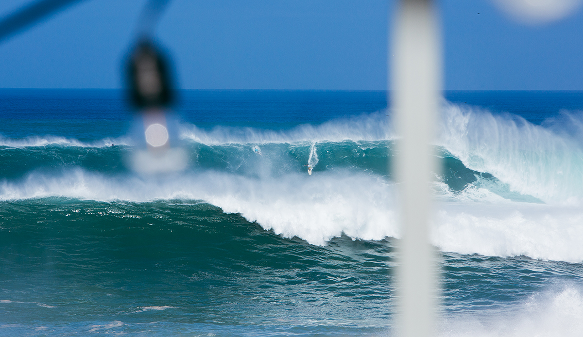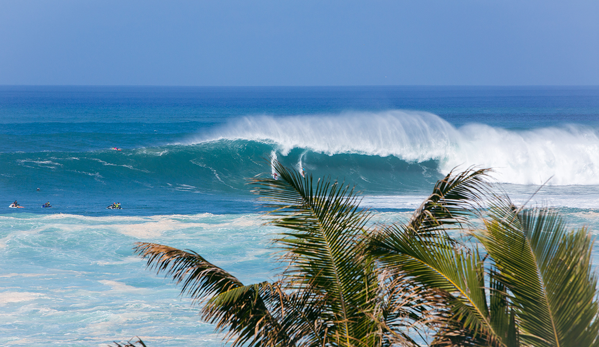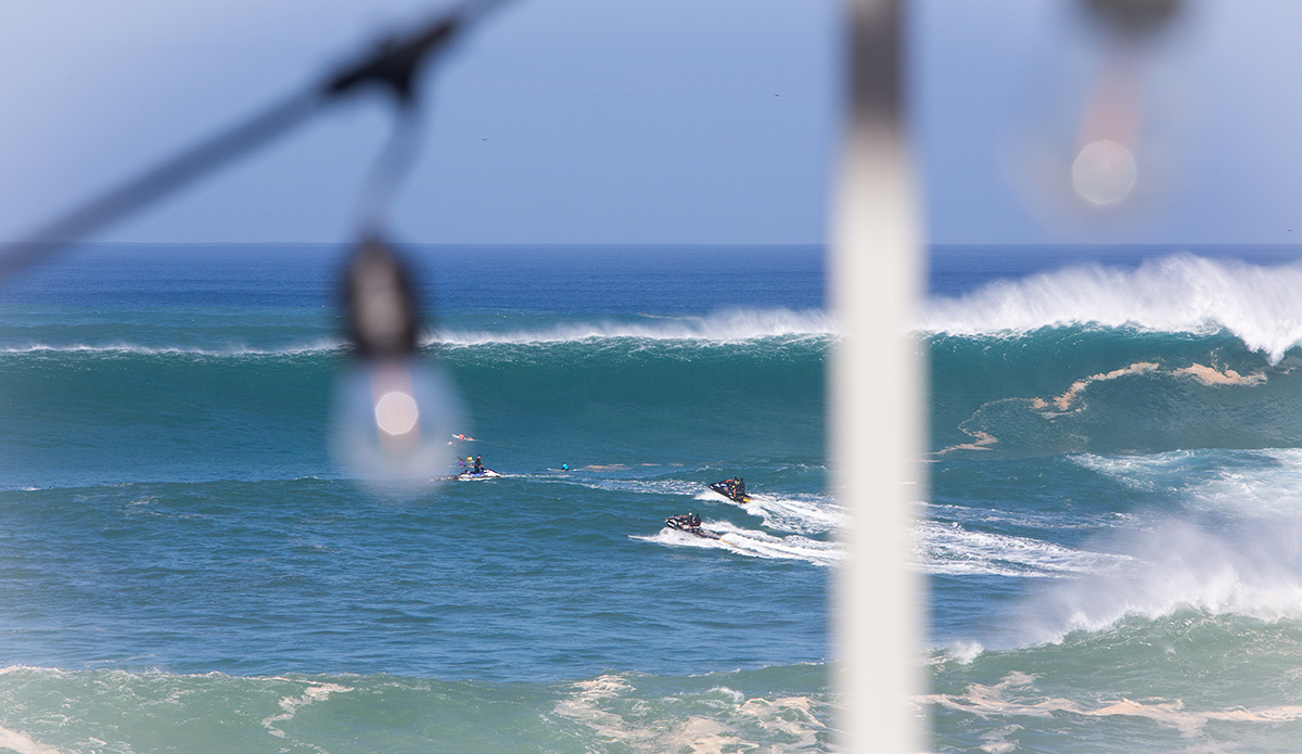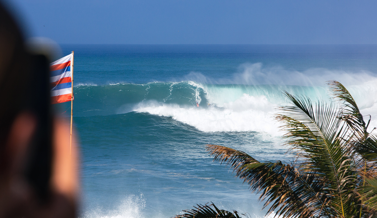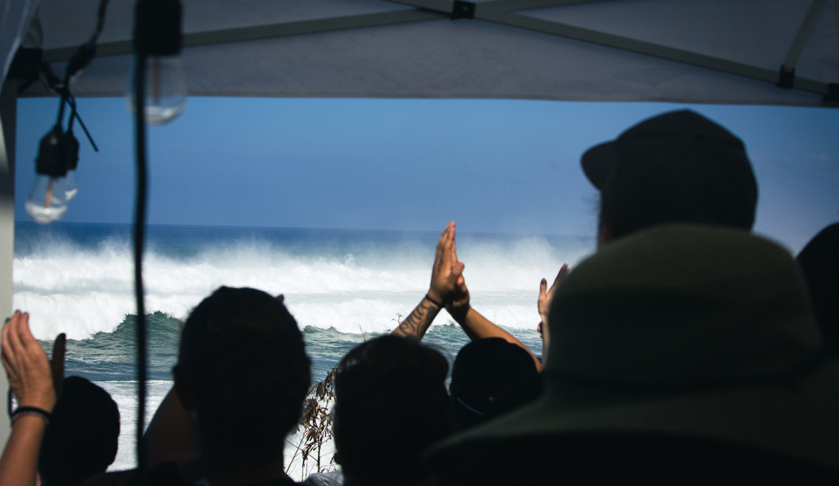 Mark Healey caught bomb after bomb. People were on the edges of their seats — and towels — as the surfers took beatings and the skis zipped in front of massive waves to get people to safety. While it was difficult to see the surfers themselves because the waves were breaking so far out, the brightly colored guns indicated who was up and riding. The crowd went wild when Nathan Fletcher, John John Florence, Kai Lenny, Zeke Lau, and, don’t forget the wahines, Emily Erickson, charged alongside Keala Kennelly, and the stoke was real to see women throwing it down out there!