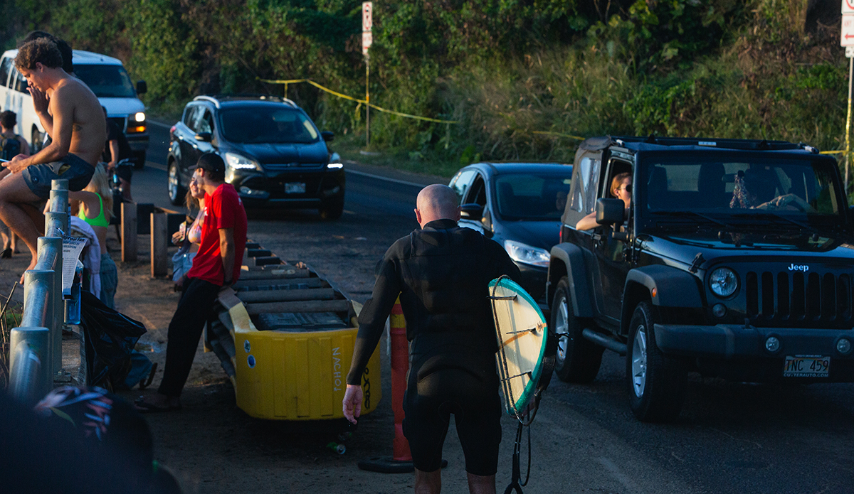Getting anywhere close to Waimea was a feat in and of itself. Everyone who surfed or had the day off was there. Parking signs read $50, and even Foodland got in on the action. Driving into the parking lot meant talking to not one, but two, security guards interrogating your intentions for parking in their parking lot. “For shopping only, it’s not beach parking!” But that day, everywhere turned into beach parking somehow.