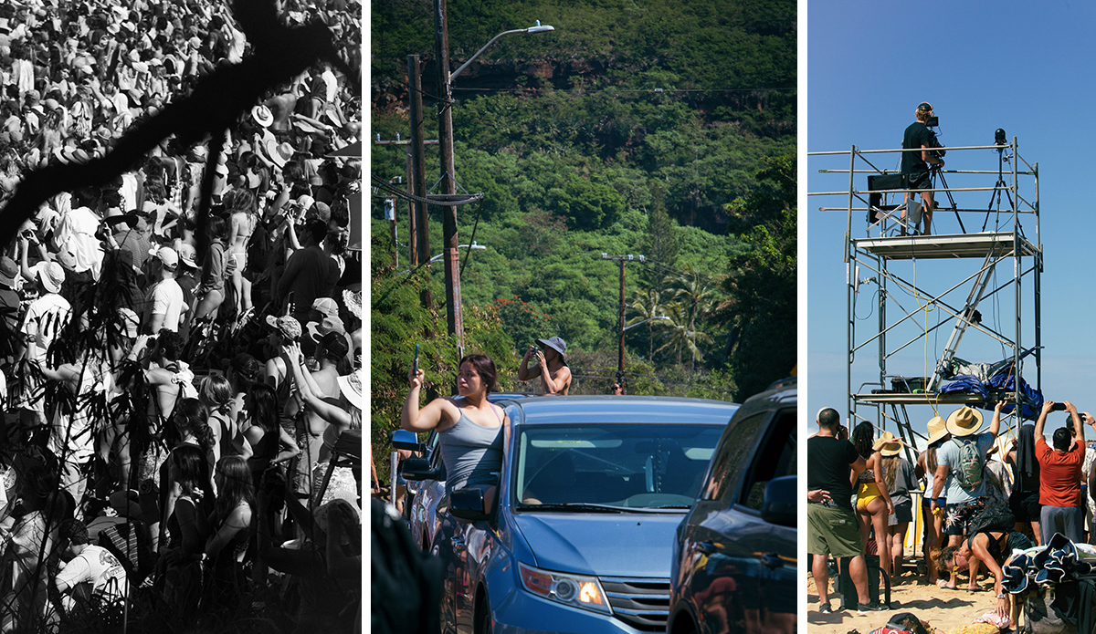 Those from other sides of the island, especially the South Shore, caravanned up in the wee hours of the night. Instagram stories of people from town showed timestamps of treks starting at two and three in the morning. The backs of pickups were crammed full of hopeful Eddie attendees, and the highways were predictably awful. Perhaps the most anticipated event of the day was the traffic, which, due to being in a constant gridlock, did not disappoint. The 60 Bus even had extra busses only for Waimea Bay. Many people were told they couldn’t even make it on the bus due to people being packed in, and some people were told they couldn’t get on because the bus wasn’t running the regular route — to the Eddie only.