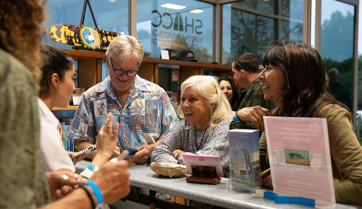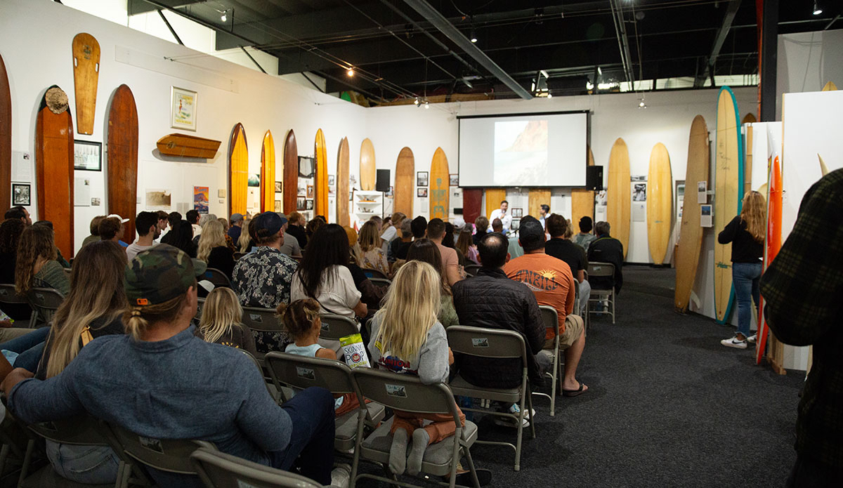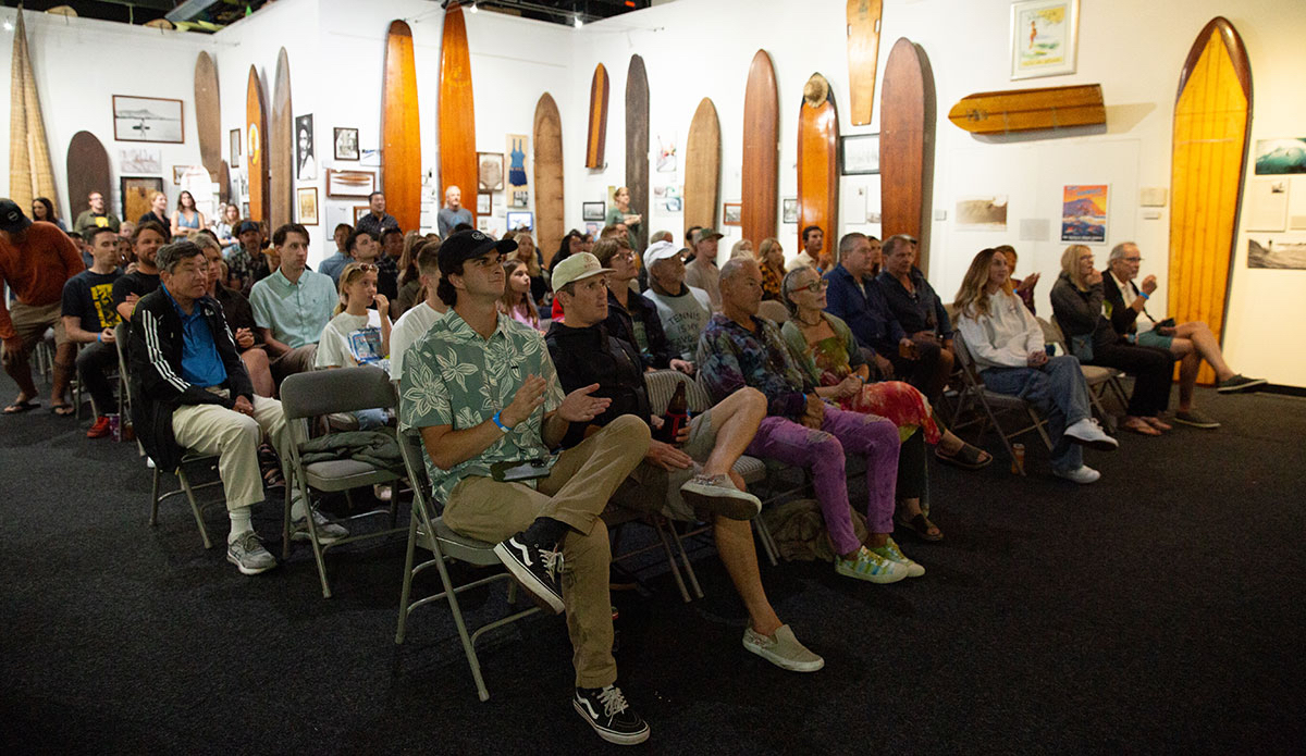 When the doors to SHACC opened, the waiting crowd perused one of the best collections of surf history in existence. Beautiful surfboards adorn the walls there, creating a timeline of surfing’s history. Duke Kahanamoku’s personal boards greet you first, then you walk through the years until you’re staring at high-performance boards ridden by today’s world champions. The original editing equipment used on The Endless Summer sits quietly in the corner, backed by Velzy’s actual shaping shed, which is full of the original tools he used and even the shoes he wore when glassing a board. They are, of course, covered in colorful resin. “When he knew he was passing,” I was told by one of the curators, “he just told us we could take what we wanted in the interests of preserving it.” Walking through the place is like walking through surfing’s history, each chapter rich and full with stories.