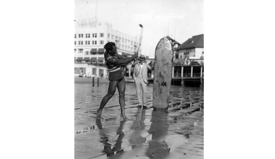 As a dark-skinned man who represented the hopes and dreams of a predominantly white nation, Kahanamoku encountered and traversed racism and ignorance well before the likes of other pioneers (including Joe Louis, Jesse Owens, and Jackie Robinson). As his swimming success continued into the 1920s, he integrated private and public pools as well as surfing at exclusively white beaches. Photographs of Duke holding white women in his arms while they swam, or bearing them aloft on his powerful shoulders while they surfed tandem, appeared in newspapers around the country. He became the living embodiment of Hawaii and its “exotic” culture—and what a symbol! He was seen as the distillation of everything that was believed to be good about the Hawaiian people: humble yet powerful, sensual and healthy, gracious and noble.