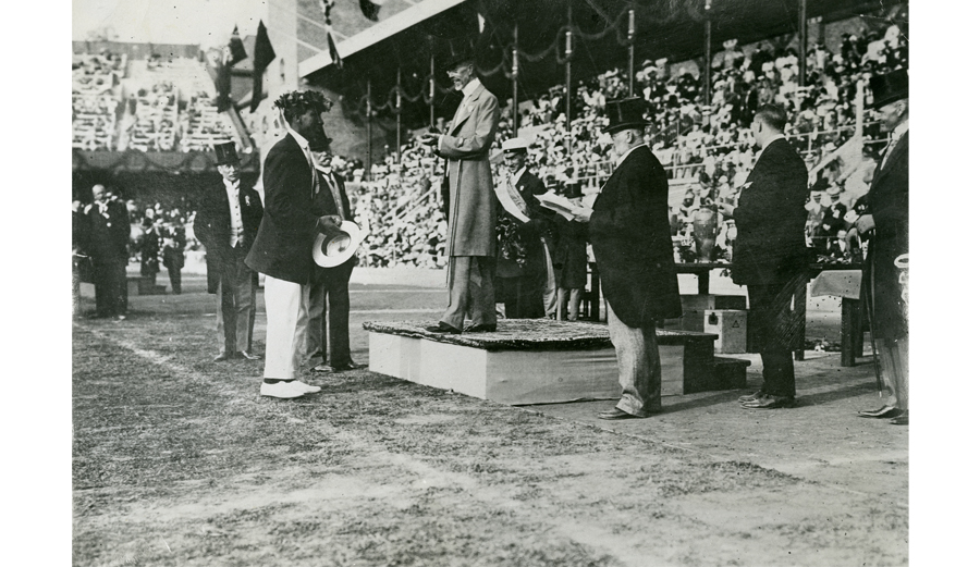 Duke receiving the gold medal from King Gustaf V at the 1912 Stockholm Olympics. Photo: James W. Gaddis.