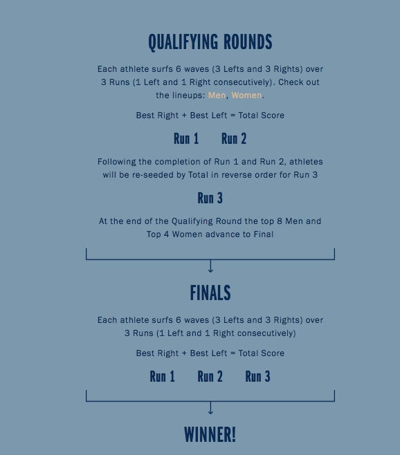 It goes like this: each of the 32 men and 18 women will surf three runs, each run consisting of two waves (a right and a left) over the course of Thursday, Friday, and Saturday. Each surfer keeps their highest scoring right and left, which gives them a total score. Before Day 3, though, surfers are re-seeded according to their totals in reverse order – lowest combined totals going first, highest going last. After Run 3, the top eight men and top four women with the highest combined totals move on to the finals.