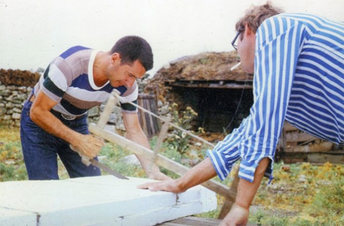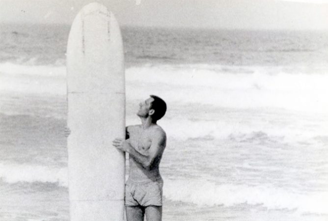 In the summer of 1966, Nikolai Popov and his friend Vladimir Prozorovsky got together for a surf expedition to the Crimea on the Black Sea, southeast of Ukraine. “At that time buying a surfboard wasn’t an option so we decided to shape it by ourselves. I found foam plates 15 centimeters thick and of a suitable length. We loaded them on top of the car and departed to Crimea. Upon arrival at Cape Tarkhankut, my friend Vova and our wives, Nadya and Nina, stopped in a small hut on the coast. In the backyard, we glued three plates with epoxy and shaped the board using knives and saws. Then we wrapped it in fiberglass, again smeared with epoxy. The fin we made out of plywood.”