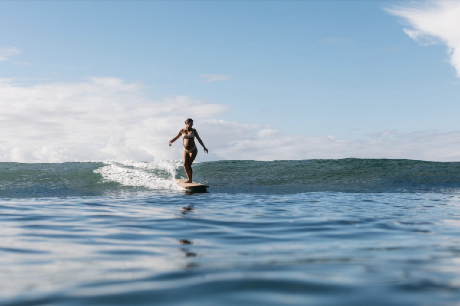Surfing while pregnant was a bit cumbersome at first — hauling around a big longboard, getting on a wetsuit with a big belly, and bruises from knee-paddling. But after a few sessions I started getting the hang of it, and really it was so nice to be in the water. I preferred using my soft-top, Catch Surf log, which was better on my knees than my longboard. The biggest challenge was learning where to position myself on the board to get into waves while knee paddling. I watched videos of Kelia Moniz as a pregnant goddess longboarding and nose riding with her big belly to get inspiration. It was also a challenge to learn how to pop up from being on your knees with a belly. I surfed up until seven months pregnant. I had morning sickness in both my first and third trimesters and decided I should take it a bit slower during my third trimester, so I just stuck with ocean dips and swims.