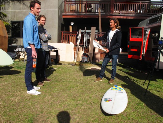 Director Tyler Manson, artist Jay Nelson, and Rob Machado prepare for a surf break.