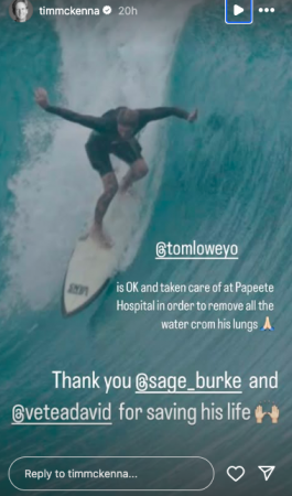 Local photographer Tim McKenna posted updates on his Instagram. According to McKenna, after Lowe’s hold-down, he was picked up in the Teahupo’o lagoon by Jet Skis driven by Sage Burke and Vetea David.