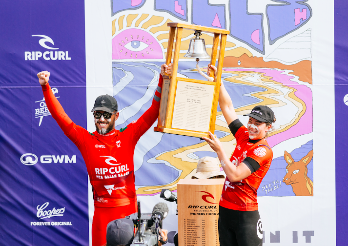 Wright and Toledo ringing the Bell for the first time. Photo: Matt Dunbar/World Surf League