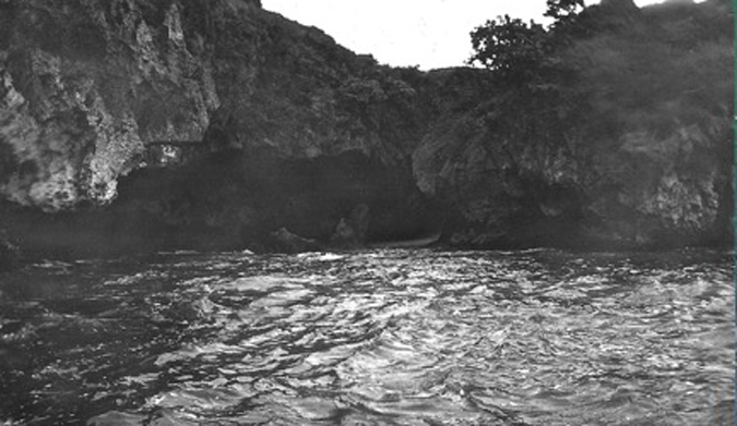 The surf and was rather large so we waited until a wave crashed against our platform to throw our boards, jump about fifteen feet into the water, retrieve the boards, and then paddle out before the next set came. We eventually made it and caught some waves, but we soon realized they weren’t the long ones we’d heard about. So we paddled around the point back towards Kuta and ended up at what later became known as Outside Corner at Uluwatu. That part of the wave was big and well formed, but it lacked the steepness for an easy drop. So we continued on down the line, blundering into what would later be named Racetrack. This was a tremendous wave. We were ecstatic. This was the wave we had been waiting for. However, after a few poorly chosen screamers, I was forced to straighten out into deeper water inside the reef where I could rest and attempt to calm my over-adrenalized mind and body before making an assault on the line up to get back outside. I waved at Tom to let him know I was OK. I looked towards shore to see a local man with a bamboo hat, loincloth and net emerged from an ominous looking cave opening. Knowing that we would eventually need to find an alternative way up the cliff and to the road, I paddled in to scope it out.