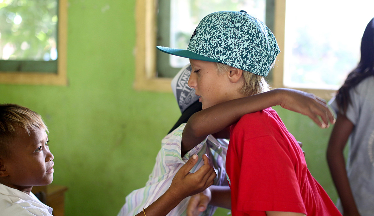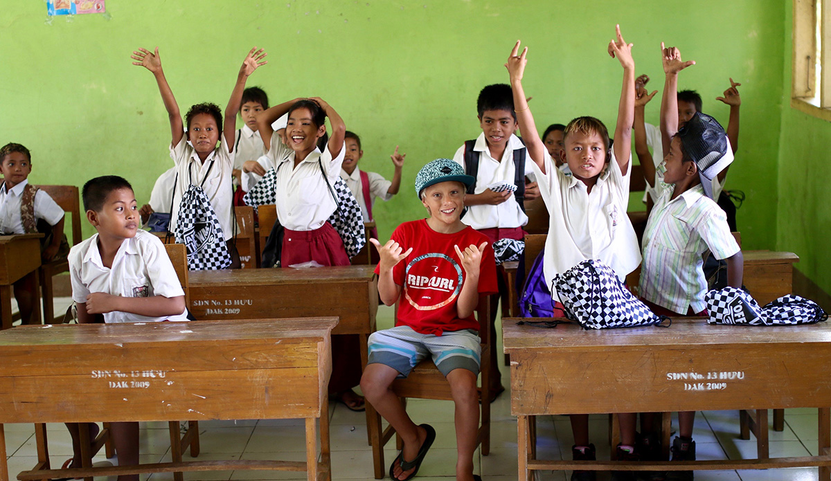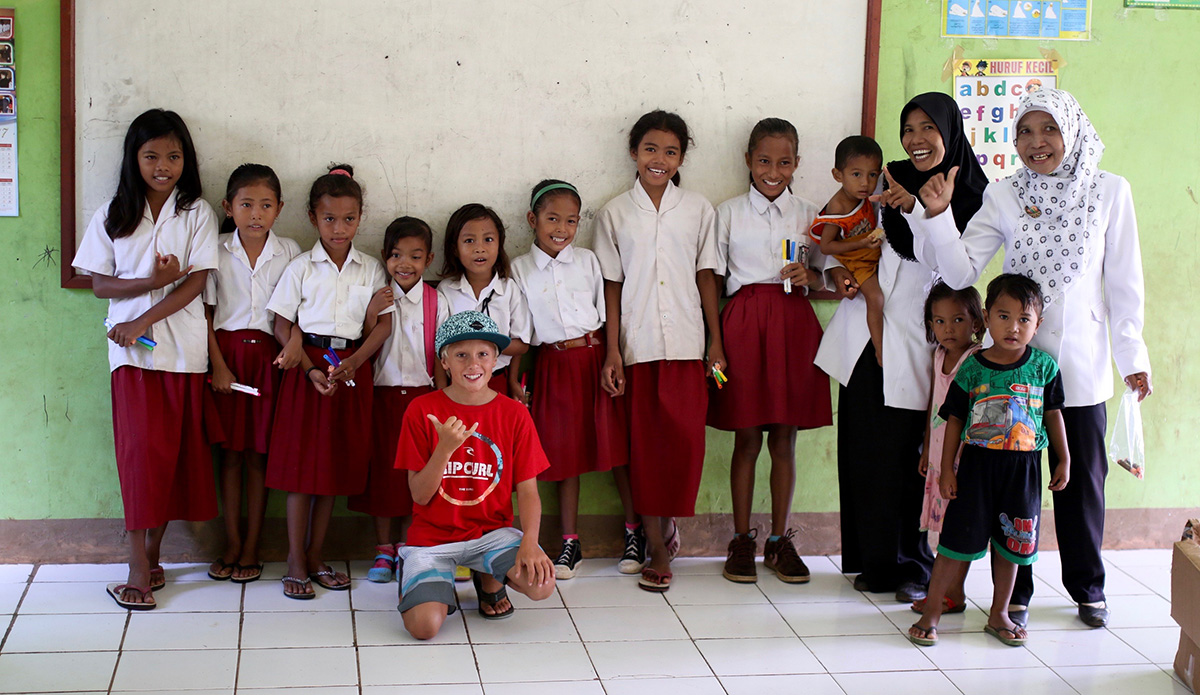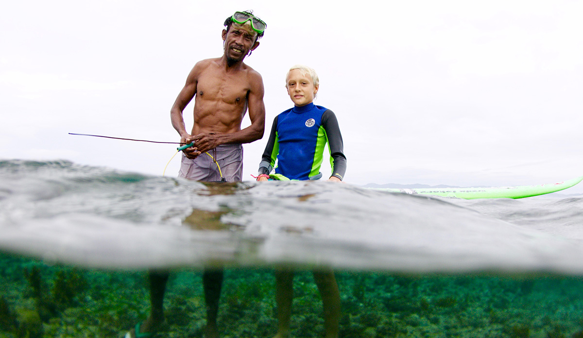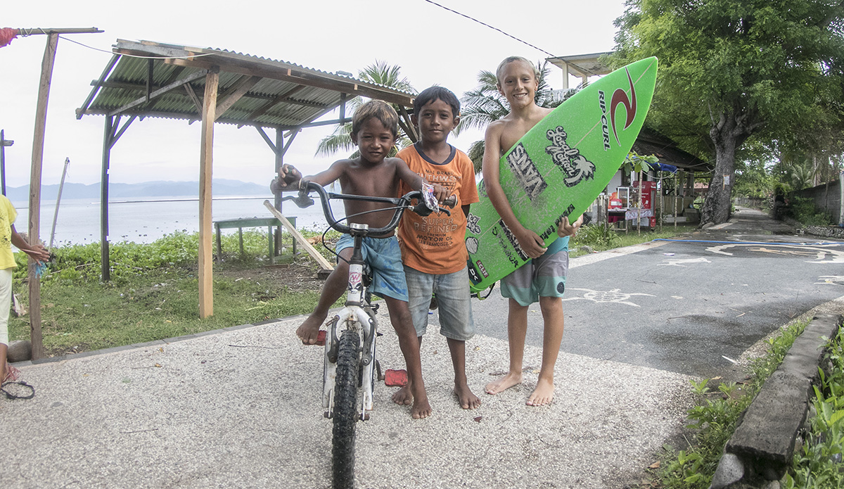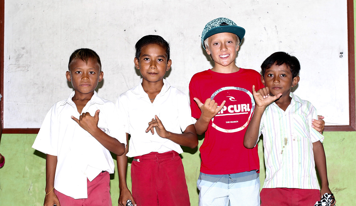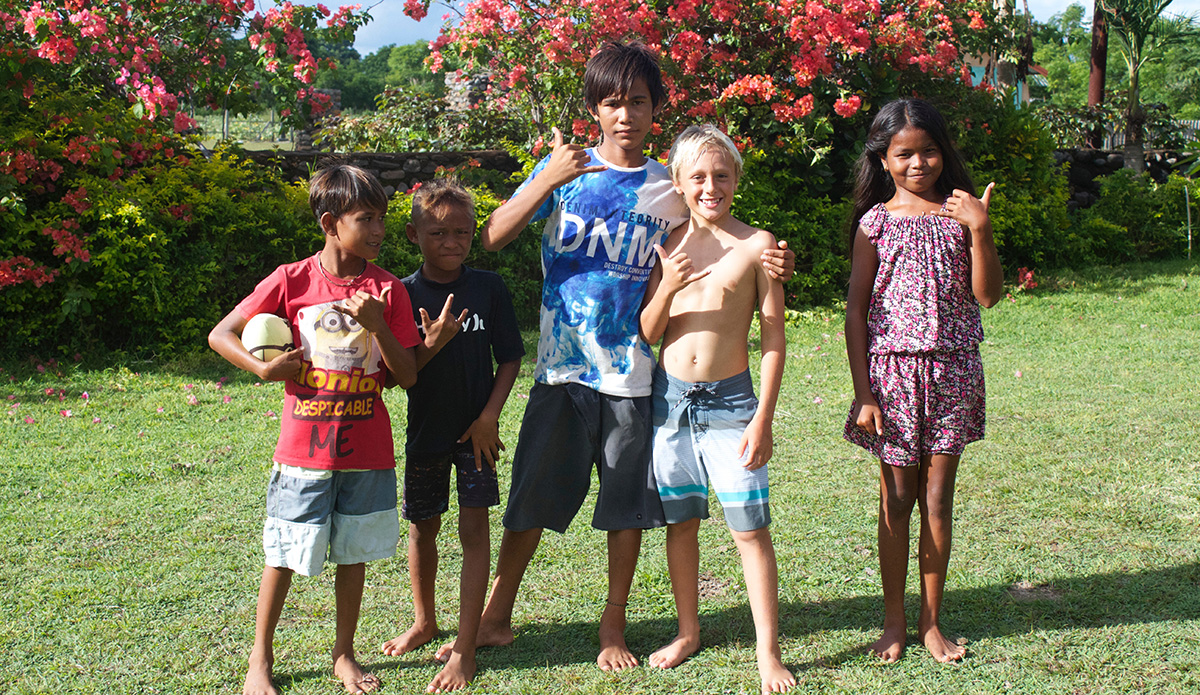 But not only did we find great waves, I got to enjoy them with great friends. The unreal sessions in the water came with some amazing experiences on land as well. One of the coolest things of the entire trip was the day all my new friends gave me the tops that they made by hand so I could bring them back to Hawaii and play with my friends at home. The kids here don’t have much. There aren’t toy stores, so for them to give me something they’d made themselves was very special and I’ll never forget it. It’s also a great takeaway that goes with the very thing my dad has been teaching me on some of our trips around the world. He says we can’t go to these places and just take, take, take, whether it’s waves or anything else. The lesson is simple: you need to give back. So on this trip he and I brought school supplies for some of the local kids, like crayons, markers, pens, pencils, and goody bags from my sponsors Rip Curl, Vans, and Sun Bum. The kids were so stoked and I loved the experience of giving them something as well. It makes you feel good inside. So I’ve learned that it doesn’t matter what you give, just do something for somebody else.