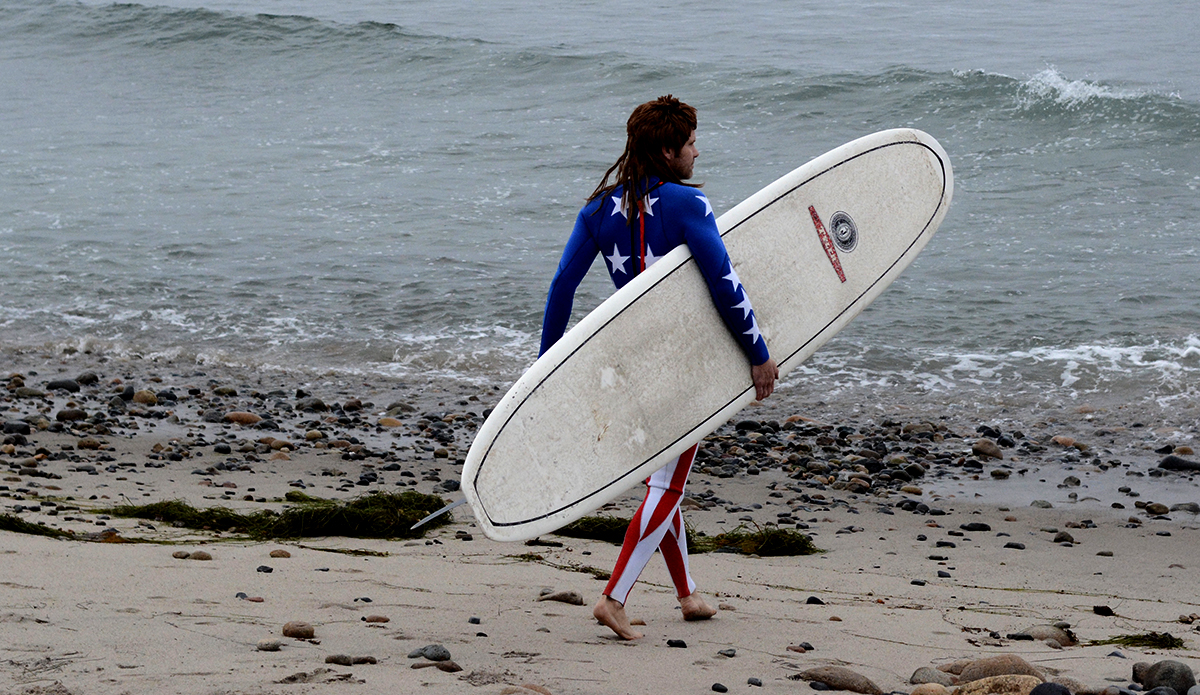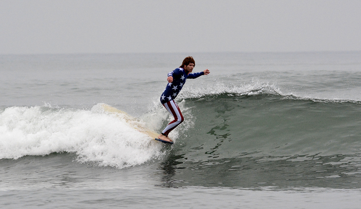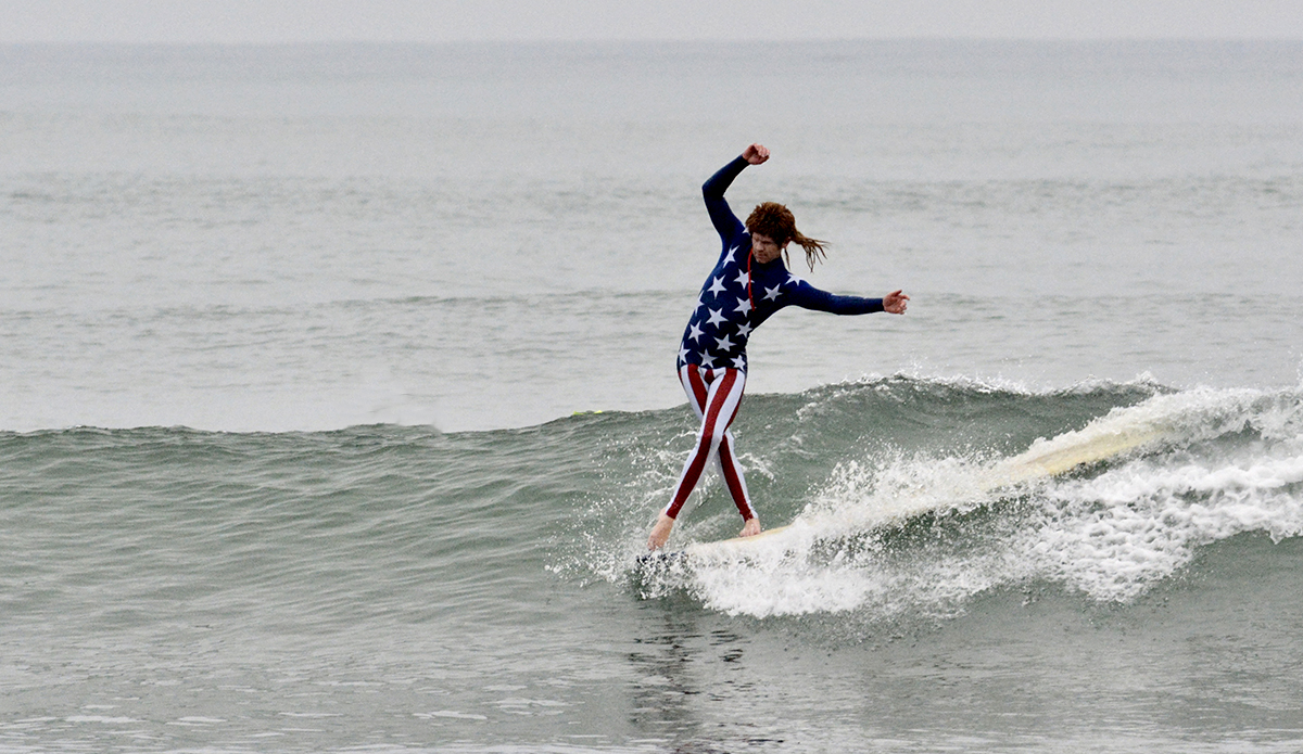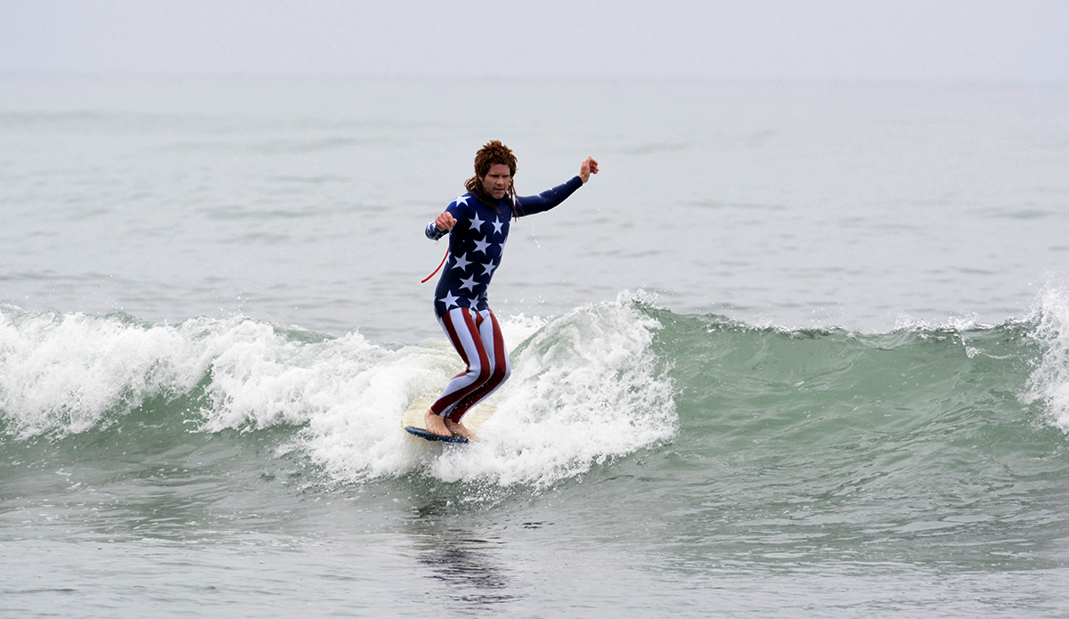 Shane Jones, Founder of Jonesea wetsuits, made himself a Stars ‘n Stripes ensemble complete with his signature “Whiskey Tango” mullet that had spectators shouting “MERICA!” from the beach. Shane birthed Jonesea wetsuits four years ago, and with 15 years total in the business has now made more than 7,000 wetsuits, including a high-fashion “suit” line for the highly revered designer Thom Browne. All Jonesea wetsuits are made with Shane’s own two hands out of a neoprene lab in Costa Mesa that’s littered with rolls of every color and pattern you can imagine.