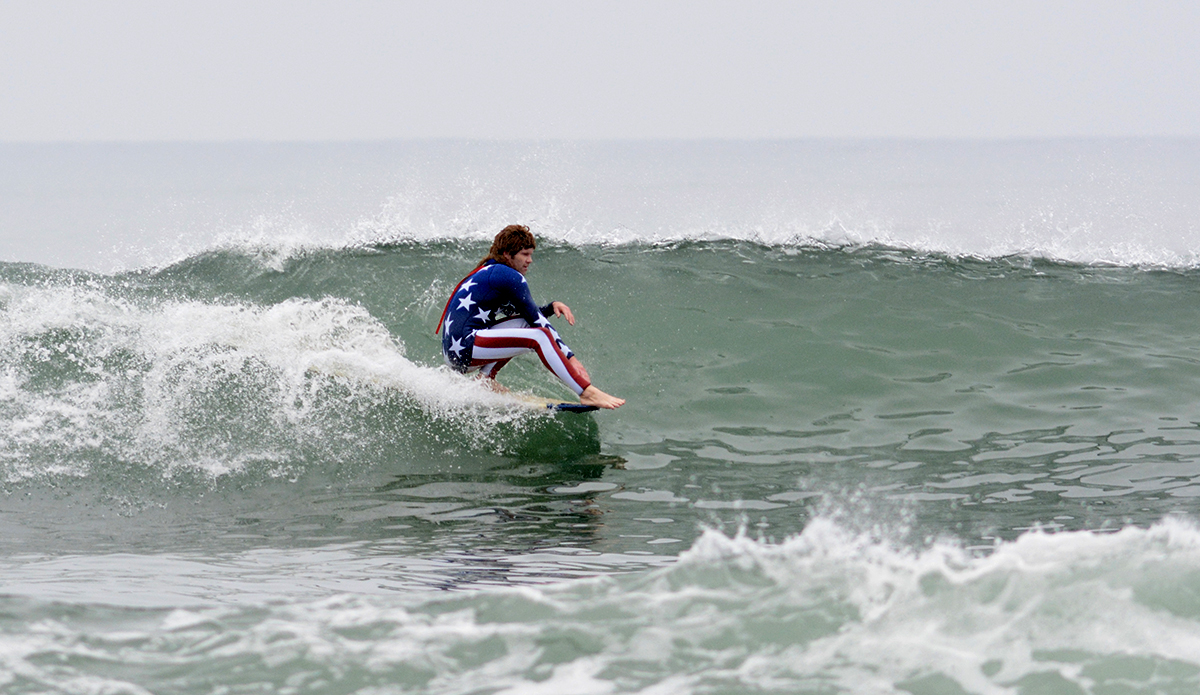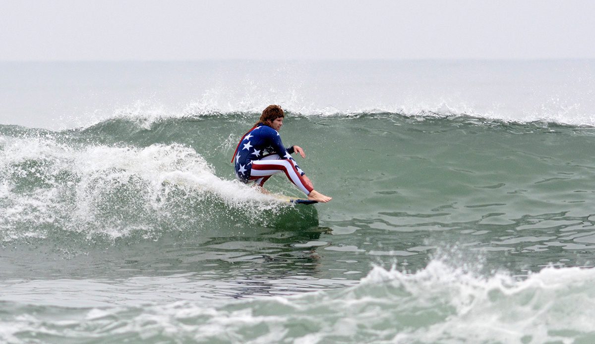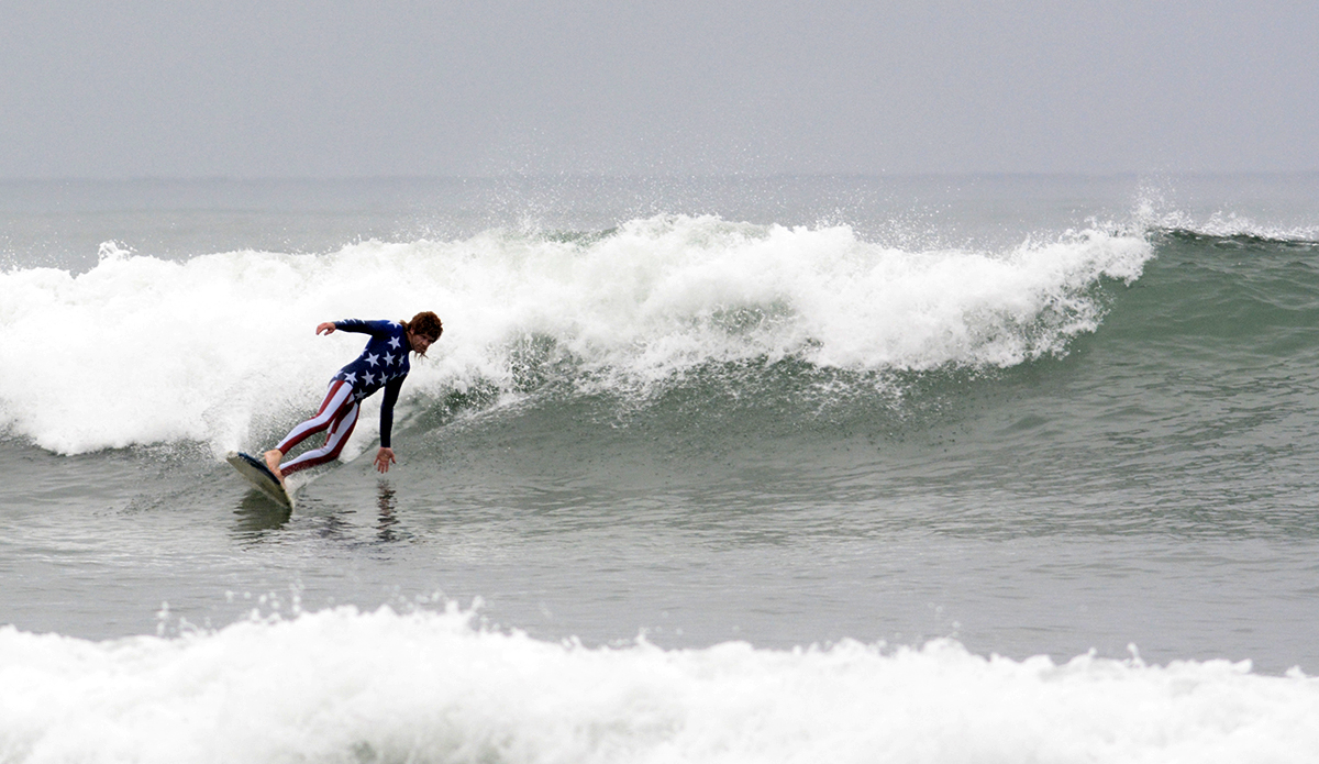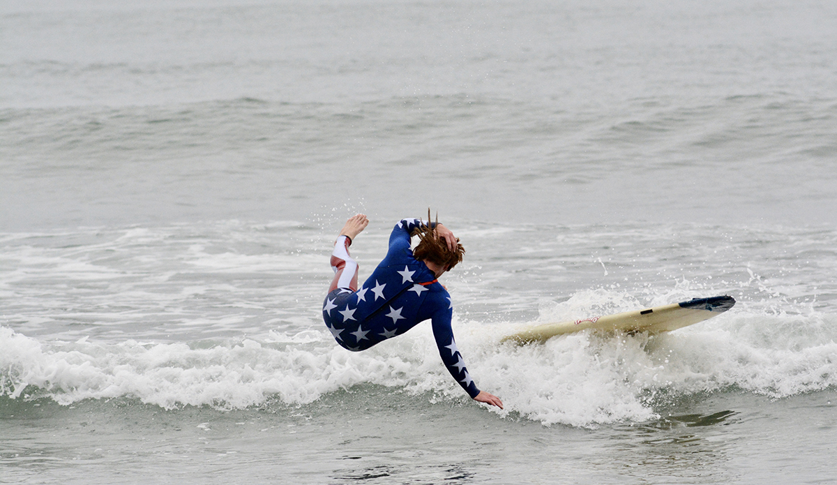 Shane Jones, Founder of Jonesea wetsuits, made himself a Stars ‘n Stripes ensemble complete with his signature “Whiskey Tango” mullet that had spectators shouting “MERICA!” from the beach. Shane birthed Jonesea wetsuits four years ago, and with 15 years total in the business has now made more than 7,000 wetsuits, including a high-fashion “suit” line for the highly revered designer Thom Browne. All Jonesea wetsuits are made with Shane’s own two hands out of a neoprene lab in Costa Mesa that’s littered with rolls of every color and pattern you can imagine.