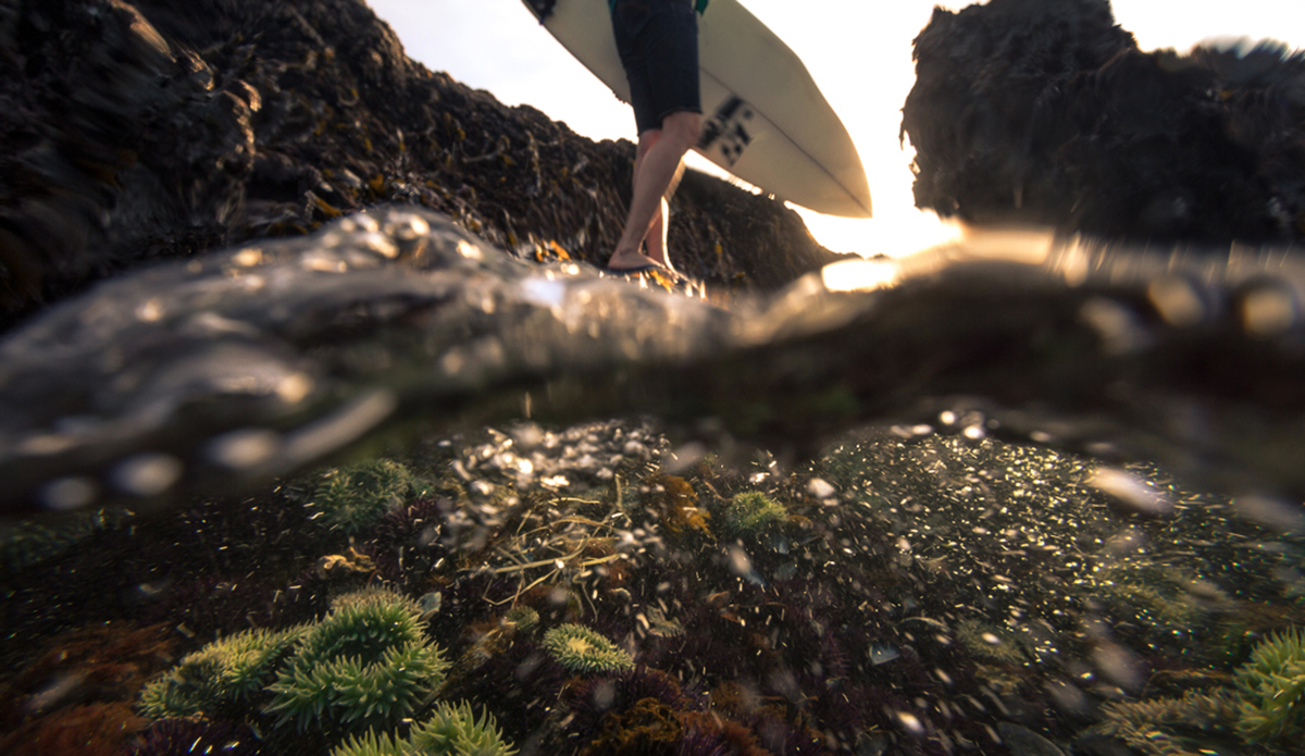 James Sayers paddling out to a secret surf spot on Southern Vancouver Island. Vancouver Island, BC. Canada.