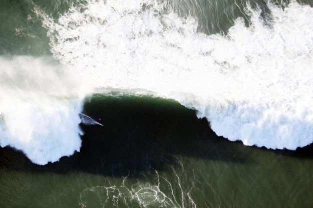 The surf at Nelscott Reef was menacing. An aerial image of a bomb surfed by Men's winner, Kohl Christensen. Photo: Bella Hunt