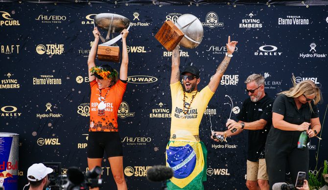 Steph Gilmore and Filipe Toledo, 2022 world champs. Photo: Beatriz Ryder//World Surf League