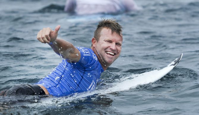Taj Burrow just surfed his last World Tour heat after narrowly losing to John John Florence at the Fiji Pro. It may not have been the storybook ending to his professional surfing career, but he, as usual, was grinning ear to ear. Photo: WSL / Kelly Cestari