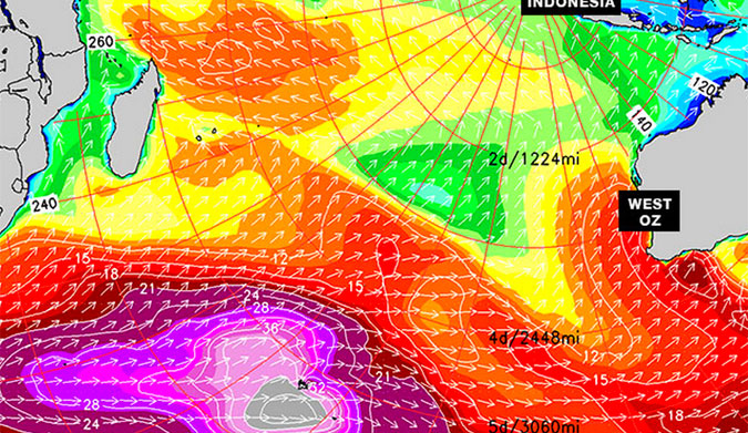 A monumental storm is currently brewing in the Southern Indian Ocean, which is predicted to produce the largest swell of the year, thus far, for Indonesia and the West Australia. The massive swell, which will start to show later this week and into the weekend, will be one of the largest swells of the past several years for both Australia and Indonesia.