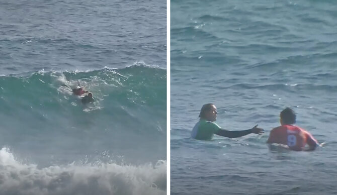 The WSL’s condensed replays of the heat curiously don’t include the paddle incident, but if you can see it at the 13:00 mark of the full replay. Or you can watch it on Instagram here.