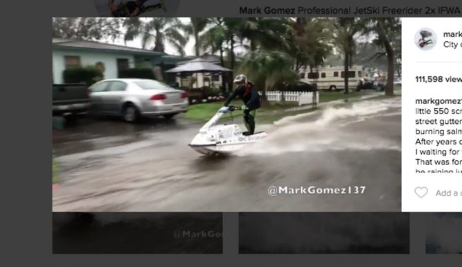 Surfing and snowboarding in the streets seems like a novel idea this winter. But only because you haven’t seen someone on a trick jet ski blazing up the road in Fullerton. And when that someone is jet ski world champ Mark Gomez fulfilling a years-long dream to ride up his street, you’re in for a treat, friends.