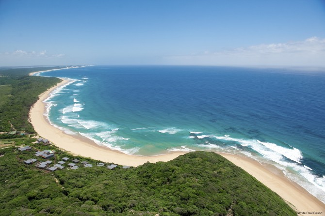 Birds eye view of WHite Peal Resort in Mozambique – good surf, beautiful beach, warm, blue water… What more does your family need?