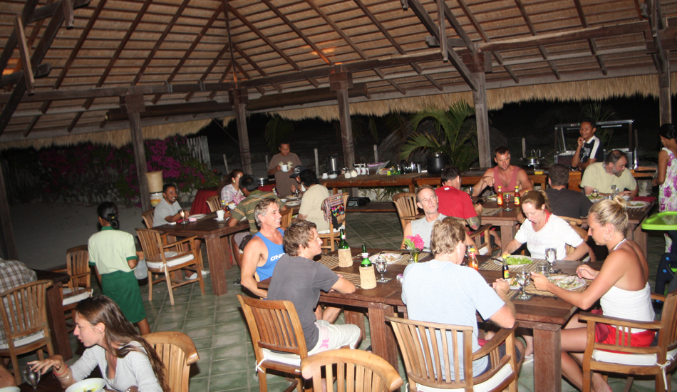 The bungalows feature a beautiful rock construction with louvered windows to keep the bungalows cool and breezy day and night. The central pool is a beautiful area to lay back with a drink and soak up the environment. The spa and games room are welcome distractions from the day’s activities. Surf transfers are provided on your schedule so you can choose when, how long, and how often you would like to surf. The four-duplex bungalows provide eight rooms each with a private bathroom. All rooms have running water and 24 hour electricity, the kitchen serves up four meals each day, a variety of western and Asian dishes.