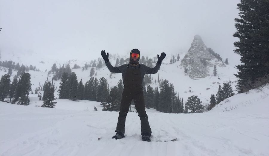 The author celebrating a snow day in front of Snowbasin’s iconic rock formation, Needles.