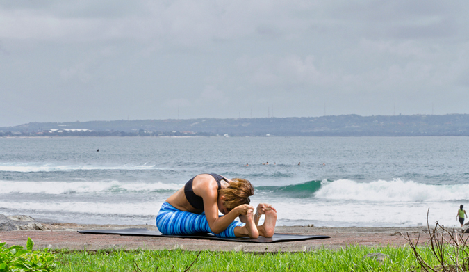 This pose is great for relaxing just before jumping in the water. While sitting, simply keep your legs straight in front of you while toes are pointing up towards the sky. While pressing in to your heels, inhale and lift your arms up. Then, while exhaling, fold your body from the hips and try to reach your toes or shins. Use a belt or towel to pull in your toes towards your body if you can’t reach. If you feel pain in your hamstring, try bending your knees a bit. Make sure that your spine is angled – not round.