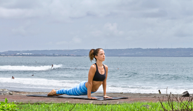 To start this pose, lie prone on your mat or on the sand and stretch your legs back with the top of the feet on the floor. Bend your elbows and bring your hands close to your rib cage and spread your fingers apart. While inhaling, use your hands to lift your upper body. Make sure that your hands are right under your shoulders and keep your neck in line with your spine. Your legs and your thighs shouldn’t be touching the floor. Press the tailbone towards the pubis and lift the pubis towards the navel. See if you can hold it for about 10-15 seconds while inhaling and exhaling easily. Note: From your upward facing dog you can roll on to your toes and find your self in downward facing dog. This pose will stretch out your spine, help your breathing technique, and aid in the flow through movements.