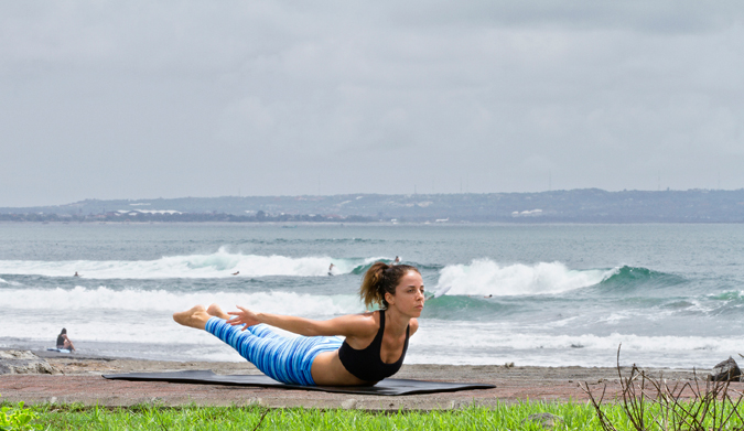 This is the perfect pose for surfers who want to improve their paddling ability. While exhaling, lift your head, upper torso, arms and legs away from the floor. You should be resting just on your belly, lower ribs and front pelvis. Reach strongly through your legs and keep your toes touching. Don’t let your legs spread apart. Repeat this pose 3 times and hold it for about 5-10 seconds while lightly inhaling and exhaling.