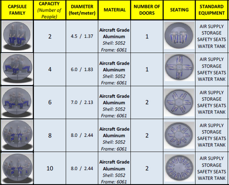 The Survival Capsules are made from aircraft grade aluminum and come in a range of sizes. Housing two to ten people, they feature an air and water supply, safety seats, and a bit of storage.